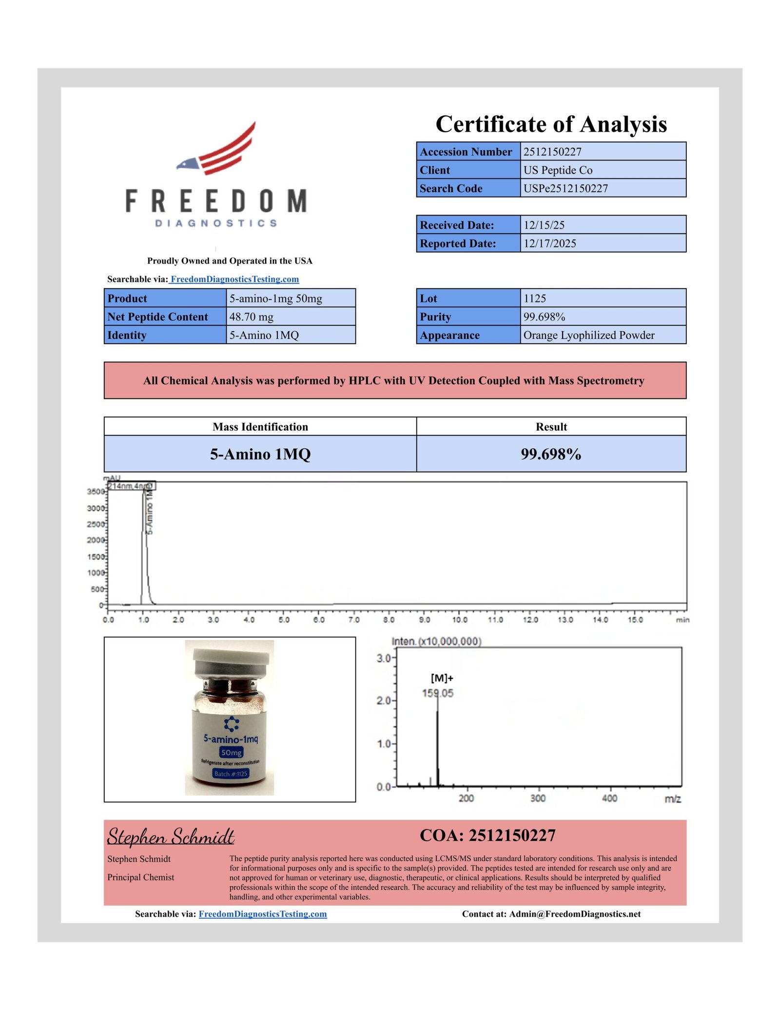 Every batch of 5-Amino-1MQ undergoes rigorous third-party testing. Each order includes a comprehensive Certificate of Analysis (COA) documenting:
