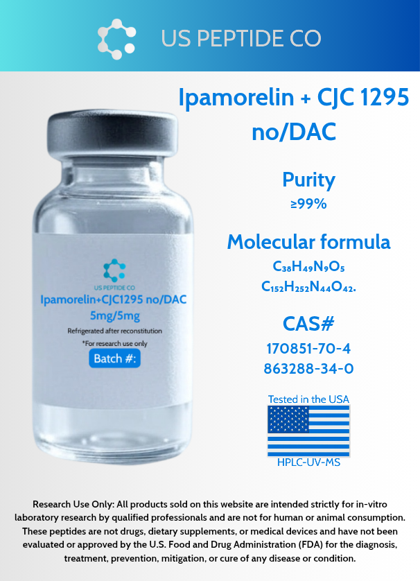 Premium Ipamorelin + CJC 1295 no DAC research blend combining two complementary peptides for advanced GH secretion studies. This Combination provides scientists with precisely formulated 5mg/5mg blend for investigating synergistic neuroendocrine pathways.