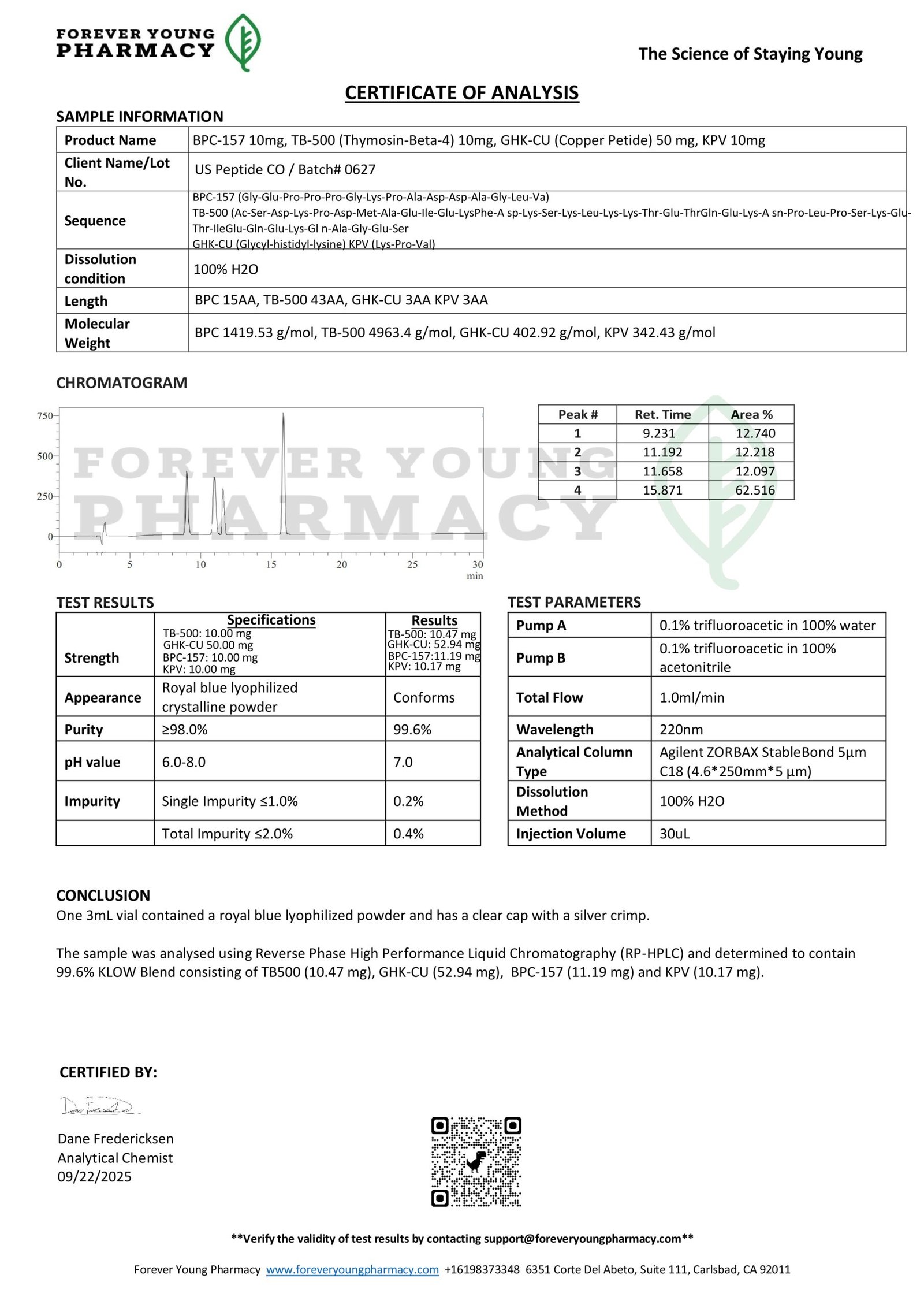 Every KLOW peptide blend batch undergoes rigorous third-party laboratory testing to verify purity, composition, and molecular integrity. US Peptide Co provides complete Certificates of Analysis (COA) with each order, ensuring researchers receive verified, research-grade peptides for their scientific protocols.