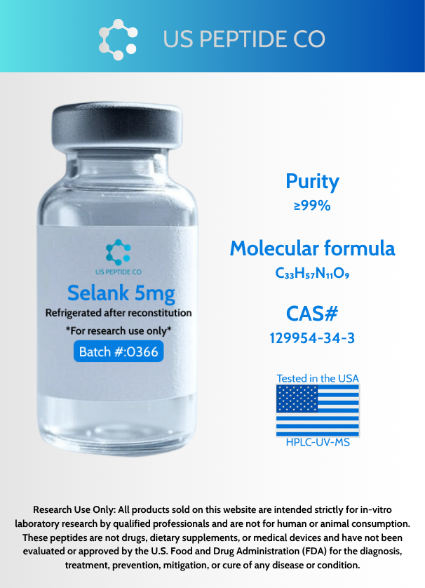 Selank is a synthetic heptapeptide derived from the naturally occurring immunomodulatory peptide tuftsin. Developed in Russia for neurological and psychiatric research, this anxiolytic peptide has been extensively studied for its anti-anxiety properties and cognitive enhancement effects. Our research-grade Selank undergoes rigorous third-party testing to ensure 99%+ purity and comes with a comprehensive Certificate of Analysis.